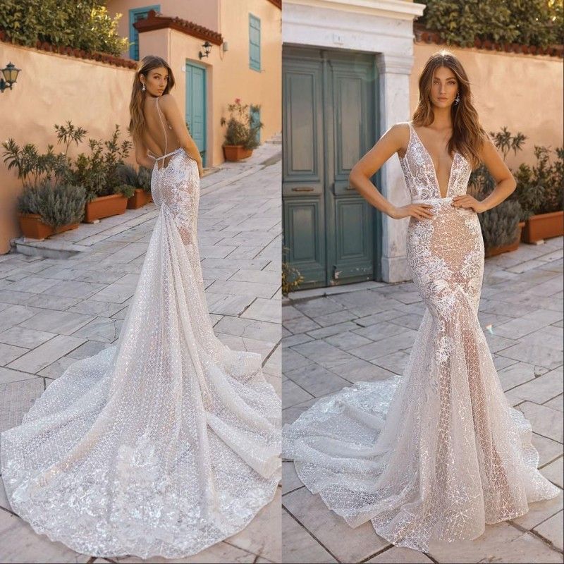 Deep V Neck Sleeveless Lace Mermaid Wedding Dress With Long Train