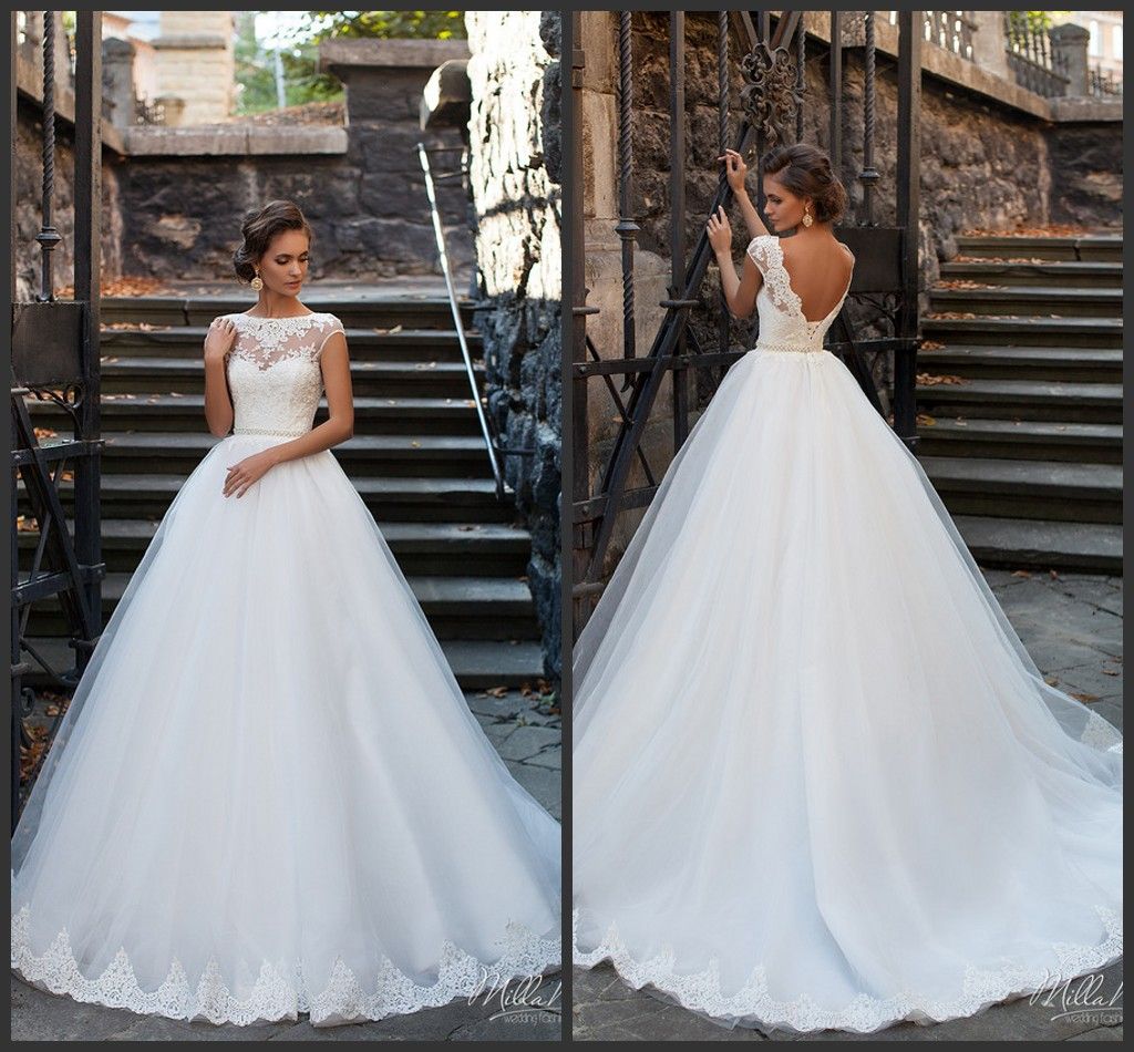 Boat Neck Wedding Dress With Cap Sleeves V Back