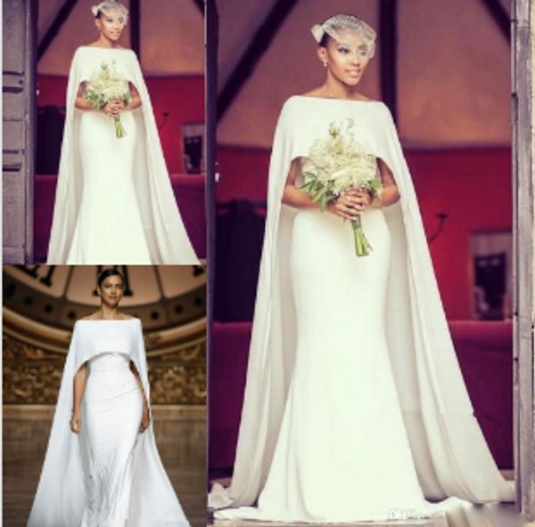 Simple Long Cape Mermaid Wedding Dresses Elegant Bateau Bridal