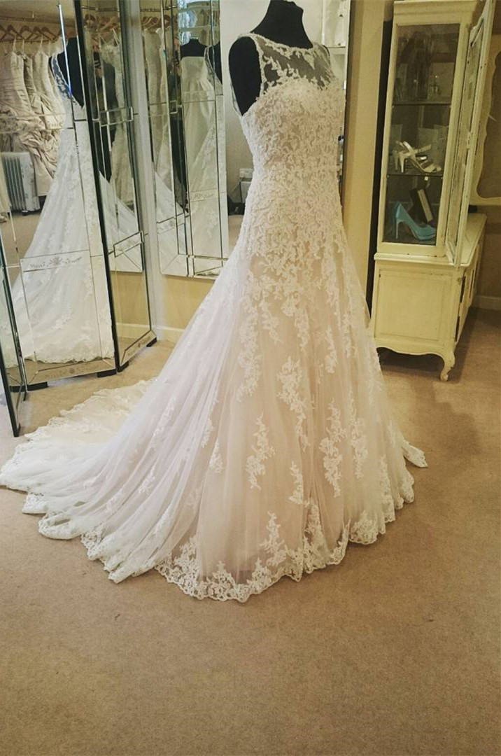 A Line Lace Applique Backless Wedding Dress With Illusion Long