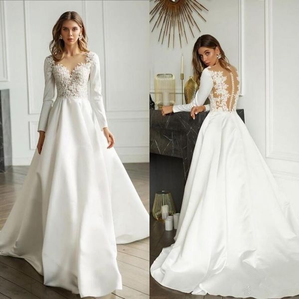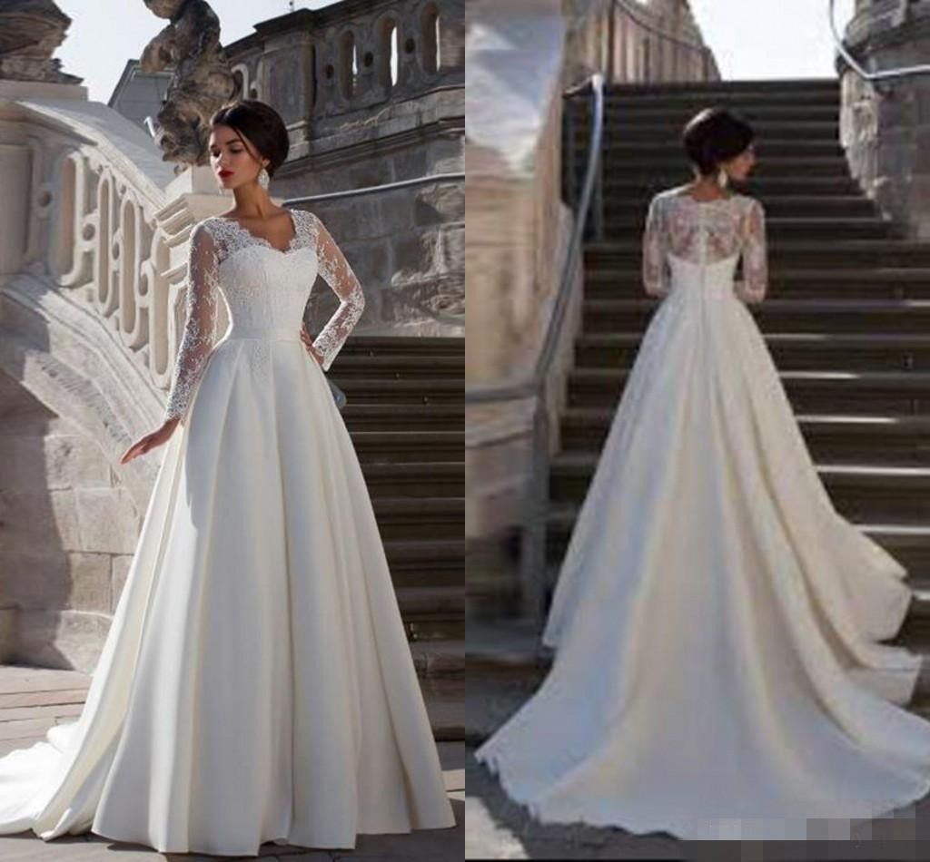 Discount 2020 Simple Satin Wedding Dresses Long Sleeve Lace