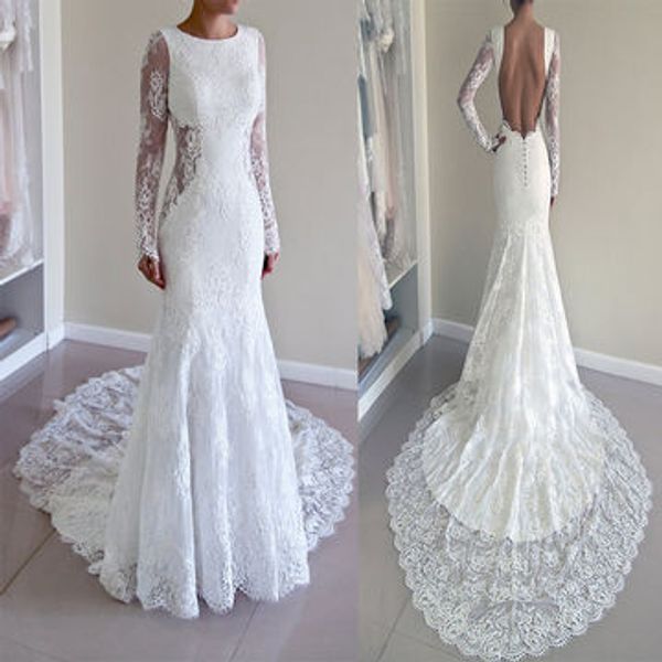 Simple Style Backless Lace Long Sleeve Wedding Dresses Bridal Gown