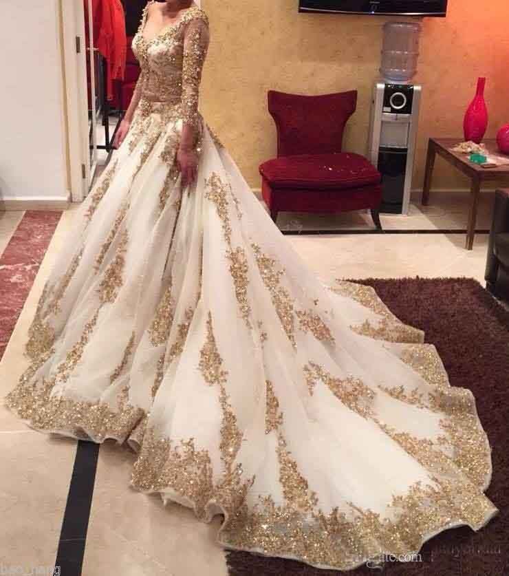 Wedding Dress V Neck Long Sleeve Arabic Bridal Gown Gold Appliques