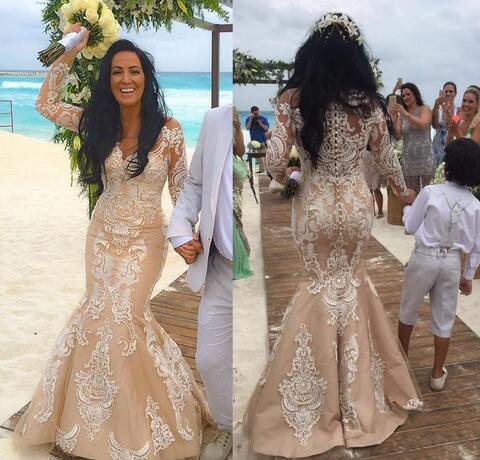 Long Sleeve Sheer Back Applique Mermaid Wedding Dresses Bridal