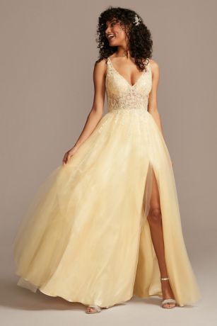 Embroidered Sheer Bodice Yellow Long Formal Prom Dress