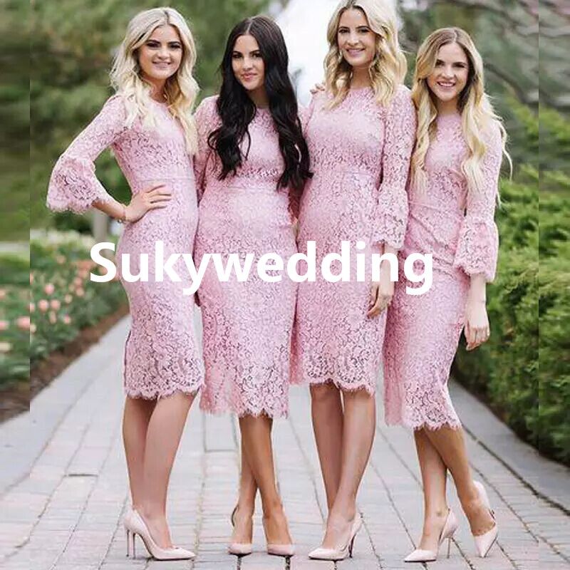 Blush Pink Lace Bridesmaid Dresses Short Tea Length Wedding Guest