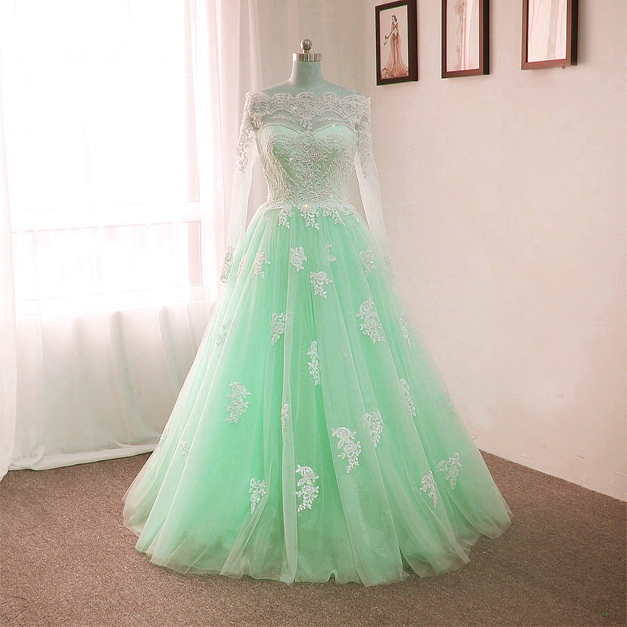 Mint Green Tulle Off Shoulder Long Sleeve Lace Applique Sweet 16