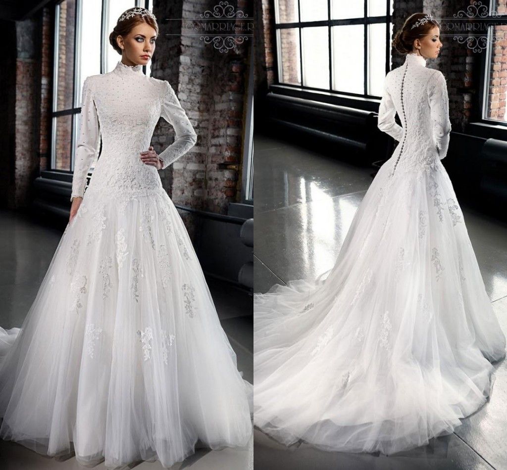 Muslim Wedding Dresses Modest Design High Neck Long Sleeve Lace