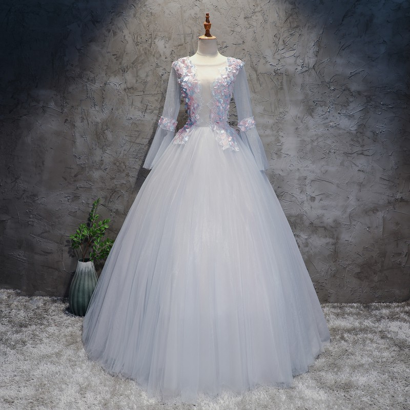 Long Sleeve Appliques Flowers Lace Princess Wedding Gown