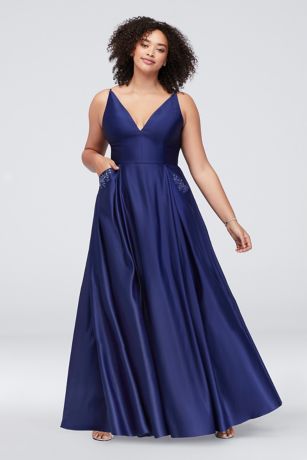Satin V Neck Plus Size Gown With Jeweled Pockets David S Bridal