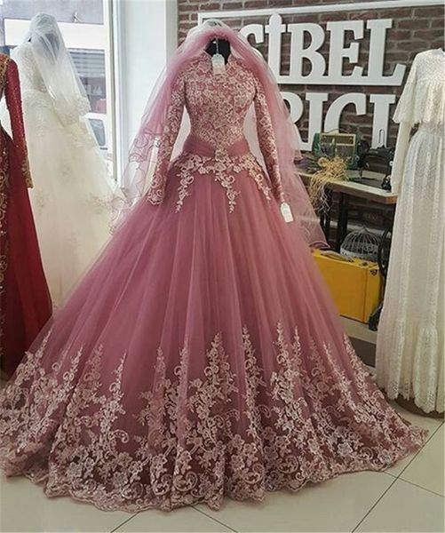 High Neck Dark Pink Saudi Arabia Muslim Style Long Sleeves Wedding