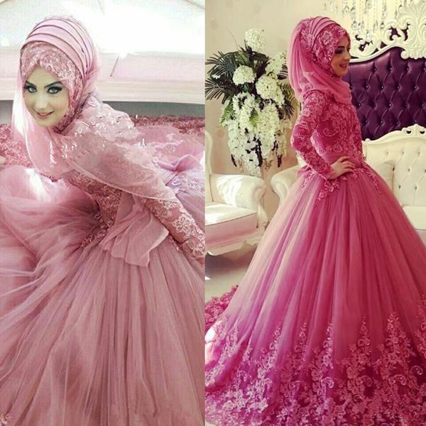 Muslim Wedding Dresses With Color Long Sleeves High Neck Lace