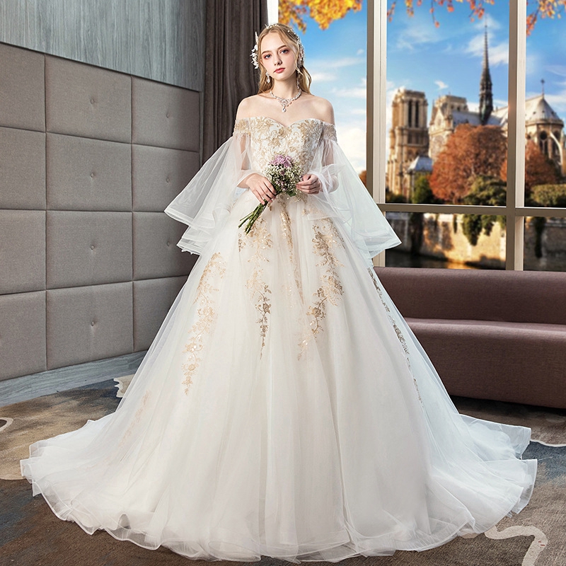 2019 New Long Sleeved Wedding Dress Shoulder Korean Big Tail Satin