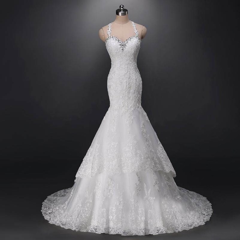 Sexy Slim Spring Mermaid Wedding Dresses Tiered Skirt Lace Organza