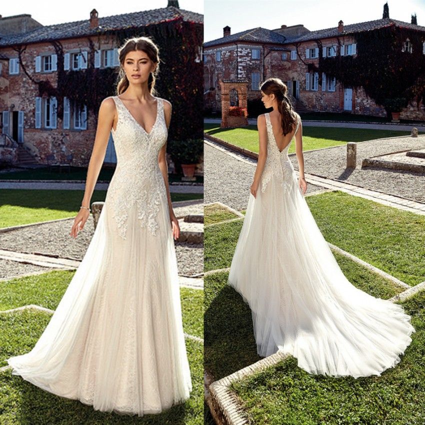 2017 New V Neck Vintage Lace Wedding Dresses Applique Tulle Bridal