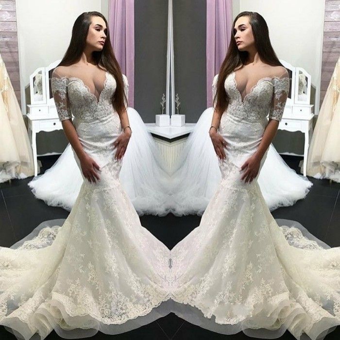 Glamorous Short Sleeve Lace Wedding Dresses Sheer Neck 2019 Sexy